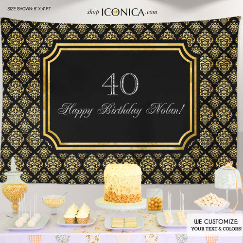 Black And Gold 40th Birthday Party Backdrop Adult Birthday - Any Age Party Banner Damask Pattern Elegant Printed Or Printable File Bbd0030