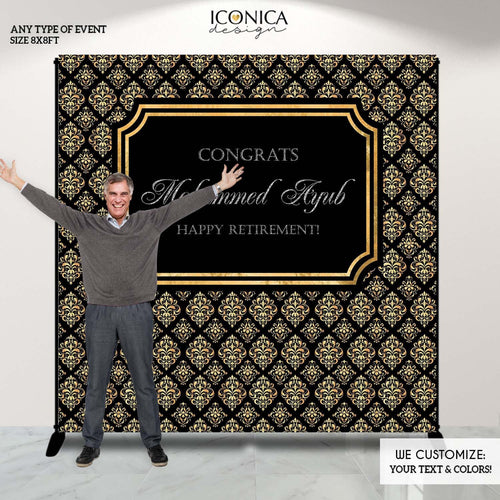 Retirement Photo Booth Backdrop, Happy Virtual Retirement Banner, Step And Repeat Backdrop, Black and Gold Backdrop, Printed Or Digital