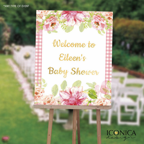 Baby Shower Welcome Sign - Floral Baby Shower Sign - Pink Gingham Watercolor Flowers - Printed or Printable File - Free Shipping
