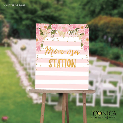 Baby Shower "Mom-osa Station" Sign, Floral Pink Stripes Sign, Mimosa Station Sign, Printed or Printable File - Free Shipping