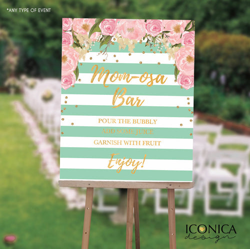 Baby Shower "Mom-osa Station" Sign, Floral Pink Mint Green Stripes, Mimosa Station Sign, Printed or Printable File - Free Shipping