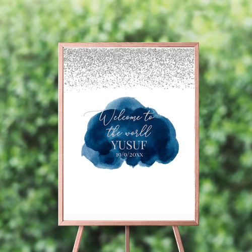 Navy Blue Watercolor Welcome Sign, Blue and Silver Welcome Baby Sign, Blue Welcome Sign, Baby Boy Shower, Printed