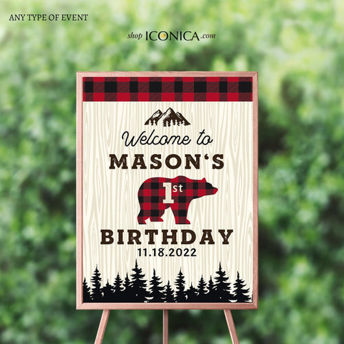 Lumberjack 1st Birthday Welcome Sign Personalized Printed Buffalo Plaid Welcome Sign Checked Plaid Red and Black plaid Lumberjack Sign